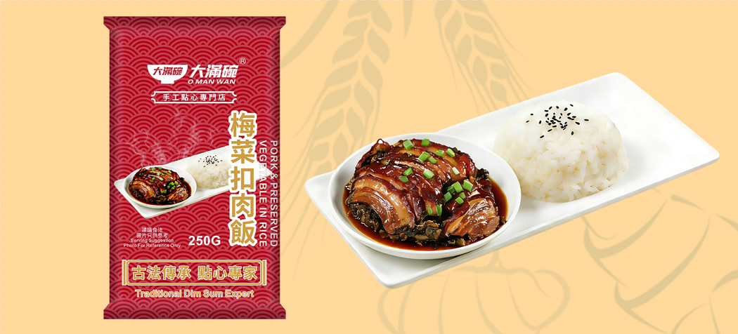 白飯(水、米)、扣肉連醬汁{豬五花肉、水、調味品[水、鹽、脫脂大豆、大豆、小麥、小麥粉、增味劑(INS 621,INS 635)、果葡糖漿、色素(INS 150c)、防腐劑(INS 202)、甜味劑(INS 955)、草菇、麵豉(水、鹽、大豆、小麥粉)、糖、釀造醬油(水、脫脂大豆、鹽、小麥)、脫水大蒜、鹹梅(梅、鹽)、增稠劑(INS 1422,INS 415)、大豆油、釀造食醋(水、大米、鹽)、香辛料(白胡椒,陳皮、花椒、洋蔥)]、大豆油、冰糖、香辛料(八角、月桂葉、小茴香、桂皮、陳皮、花椒、蔥、蒜、薑)、南乳(大豆、水、鹽、食用酒精、紅麴米、小麥粉)、料酒[水、糯米、小麥、色素(INS 150a)]}、梅菜[梅菜、調味油[大豆油、芝麻油]、糖、薑汁]。