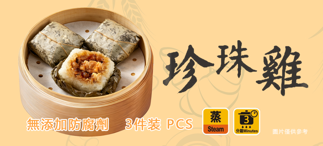 珍珠雞 成分:糯米、水、雞肉、糖、豬油、沙葛、豬肉、芝麻油、增味劑(E621)、鹽、臘腸(豬肉、糖、鹽、蒸餾酒、腸衣)、增稠劑(E1442)、醬油(水、大豆、小麥、鹽)、蝦米、大豆油、蠔油(蠔汁、水、糖、鹽、增稠劑(E1442)、增味劑(E621)、小麥粉、色素(E150c))、紹興酒(水、糯米、小麥)、蒜頭、冬菇、胡椒粉。